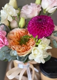 фісташка, евкаліпт, фрезія, троянда, жоржина, еустома, гвоздика